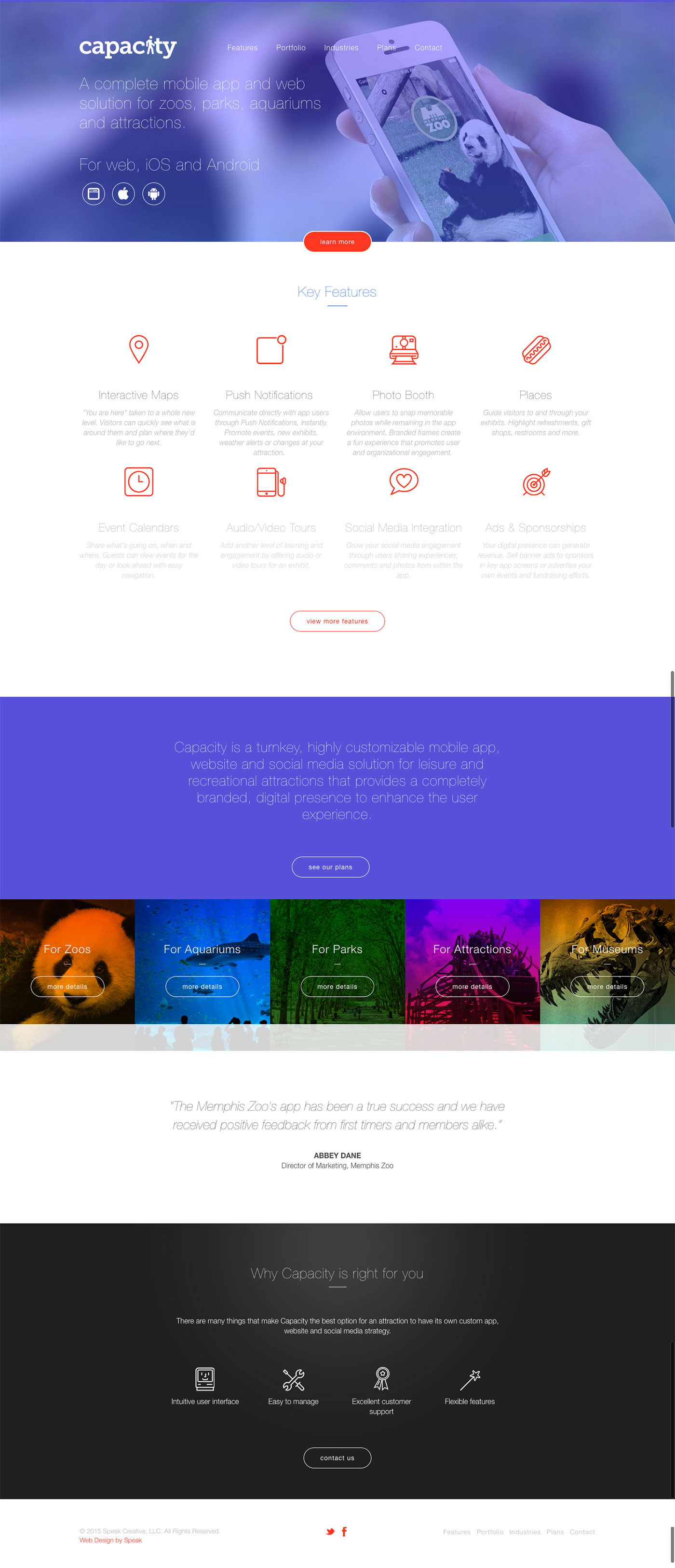 Previously known as theZooApp, Capacity is an app for Zoos, Aquariums, Parks and attractions. It was rebranded in 2014, and I undertook content analysis (subsequently restructuring the site) and the UI Design. This was done in-browser to speed up completion.